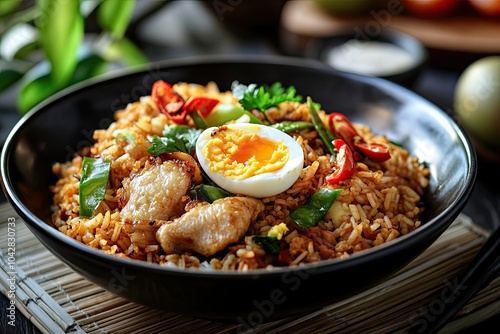fried, rice, chicken, egg, vegetable, bowl, black, dish, food, asian, cookery, healthy, delicious, meal, dinner, lunch, tasty, protein, carbohydrate, red, pepper, green, pea, parsley, yolk, white, brown, wooden, mat, plate, table, background, closeup, studio, shot, fresh, ingredient, favor, appetising, flavorful, colourful, vibrant