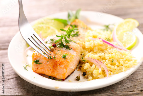 salmon, fillet, fried, grilled, food, cookery, culinary, diet, healthy, healthy eating, health, dinner, lunch, meal, vegetarian, herb, lemon, plate, fork, closeup, delicious, omega 3