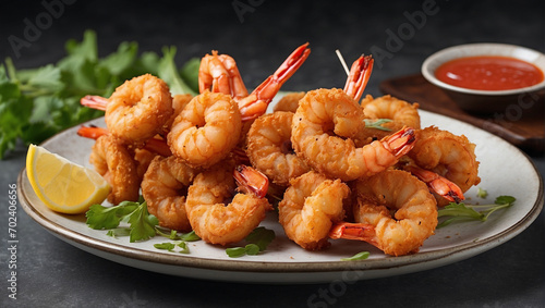 Fried shrimp in batter with a crispy crust. Restaurant serving with herbs, lemon on a dark background
