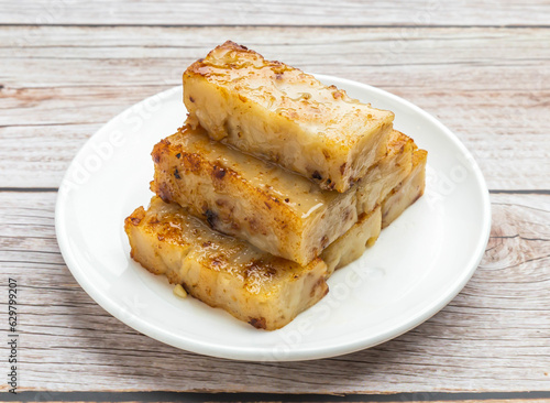 fried white turnip cake served in dish isolated on wooden table top view hong kong food