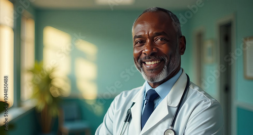 Friendly adult male doctor in workwear with stethoscope on neck in clinic interior, looking and smiling at camera, copy space