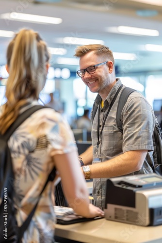 aerodrome, employee, traveler, baggage, smiling, assistance, customer service, professional, friendly, goggles, beard, travel, help, check-in, staff, people, crowd, traveler, terminal, journey, transportation, helpful, desk, interaction, uniform, working, business, communication, passenger, human relationships, support, guidance, workplace, hospitality, airline, cheerful, service sector, tied-up
