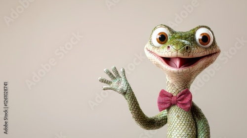 friendly, snake, cartoon, character, waving, tail, bow tie, cute, smile, happy, cheerful, animated, reptile, playful, green, fun, joy, emotion, greeting, whimsical, quirky, fashion, personality, expressiveness, gesture, innocent, vibrant, happiness, children, nature, wildlife, exotic, animal, fantasy, imagination, creativity, animation, design, illustration, concept, blithe, charming