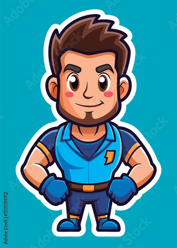 Friendly cartoon worker in blue uniform.