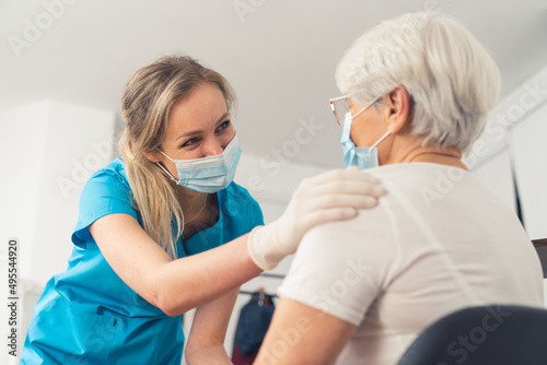 Friendly caucasian nurse supporting an elderly retired lady. . High quality photo
