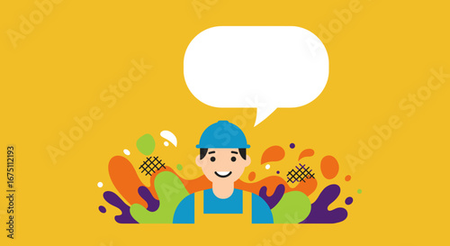 construction worker, hard hat, professional, occupation, employee, labor, service, job, career, safety, communication, speech bubble, message, text, dialogue, advice, information, announcement, support, friendly, happy, smiling, expert, business, industry, vector, cartoon, yellow background, colourful