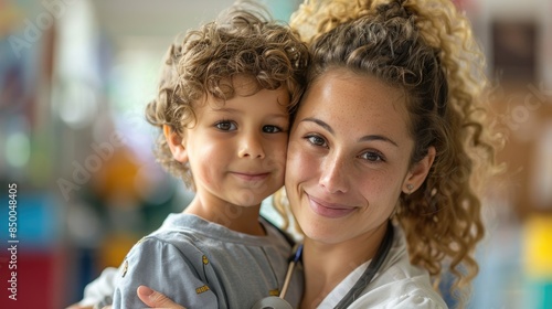 friendly, female, doctor, smile, hug, young, children, hospital, set, show, impact, health care, approach, action, support, zone, kindness, gesture, service, warm, patient, patience, courage, children, radiate