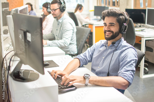 Friendly handsome young man with hands-free headset working on computer in call centre