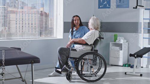 Friendly rehabilitation therapist speaking with handicapped aged patient