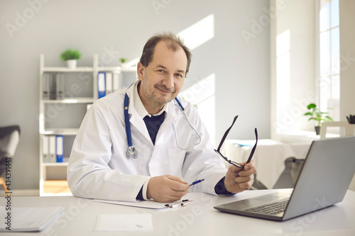 Friendly senior male doctor sits in his office in front of a laptop and fills out medical records. Portrait of a doctor sitting at his workplace and looking at the camera. Concept of medical work.