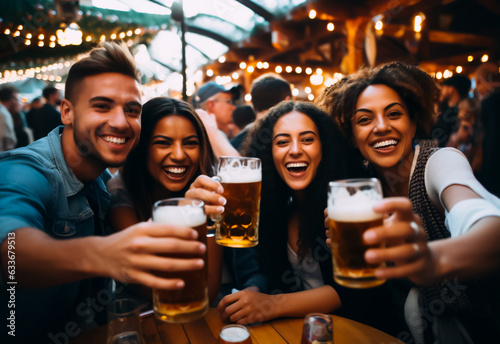 Friends at the Oktoberfest in Germany, toasting with big mugs of beer, looking happy. Shallow field of view.
