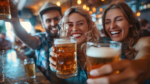 Friends cheers with beers in lively bar celebrating together in bright setting. Concept Friends, Cheers, Beers, Bar, Celebration