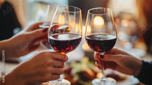 Friends clinking glasses at dinner, cozy restaurant, clean background, copy space