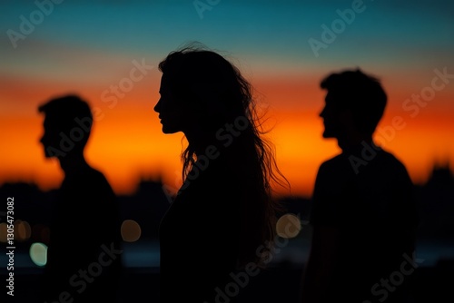 silhouette, sunset, friends, dramatic, vibrant, sky, dusk, evening, twilight, togetherness, friendship, orange, colourful, backlight, skyline, city landscape, city, light, bokeh, gold, hours, outdoors, nature, connection, human relationships, people, group, young, adult, contemplation, peaceful, serene, mood, atmosphere, love, romance
