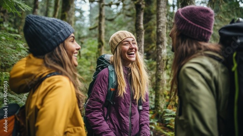 Friends having fun during a forest hike, capturing candid moments of joy and friendship