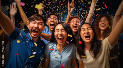 friends, celebration, smiling, party, happiness, joy, man, fun, happy, excitement, cheerful, confetti, indoor, togetherness, group, entertainment, lifestyle, friendship, colourful, gathering, energetic, youth, vibrant, leisure, woman, event, lively, enjoyment, people, laugh, festive, nightlife, laughing, carefree, emotion, dynamic, social, noise, shouting, crowd, cheer, scream