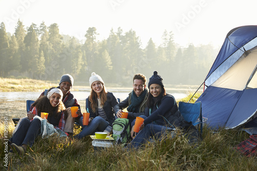 outdoors, young adult, 30s, 20s, woman, man, friends, friendship, caucasian, black, diversity, nature, togetherness, bonding, relaxing, sitting, vacation, holiday, avocation, calmness, adventure, drinking, tent, lake, talking, communication, happy, smiling, autumn, fall, copy space, full-length, horizontal