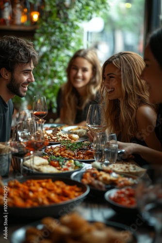 Friends Smiling and Talking While Enjoying Delicious Food tapas and drinks at an Outdoor Restaurant