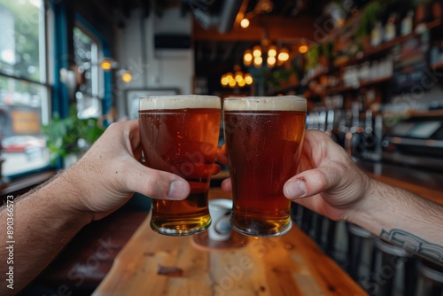 Friends toasting with beer mugs in a cozy pub celebrating friendship and good times
