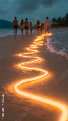 Friends Walking On Beach With Light Trail At Sunset