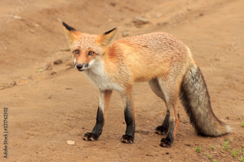Frightened fox, standing in an open place on the road at Cape Tobizin on the Russian island in Vladivostok.