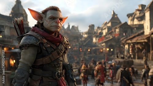Frightening Goblin Character in a Bustling Fantasy Village Setting