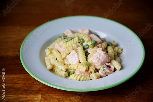 food, fish, salmon, filet, norge, europa, noodle, cream, sauce, pea, fresh