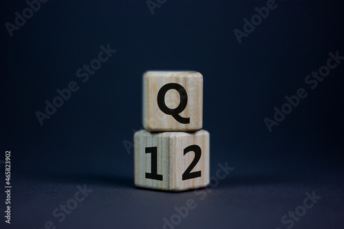 From 1st to 2nd quarter symbol. Turned wooden cubes and changed words 'Q1' to 'Q2'. Beautiful grey table, grey background. Business, happy 2nd quarter Q2 concept, copy space.