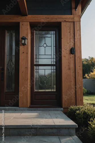 Front entrance featuring a wooden frame door with decorative glass panels, surrounded by stone steps and greenery.