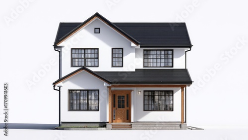 house, home, facades, two-story, modern, minimalist, white, black, dark, roof, trim, exterior, architecture, design, residential, front, building, structure, contemporary, simple, clean, geometric, window, door, porch, step, concrete, light, shadow, isolated, digital, render, three-dimensional, illustration, model, property, real estate, dwelling, urban, suburban, charming, architectural, residence, classic