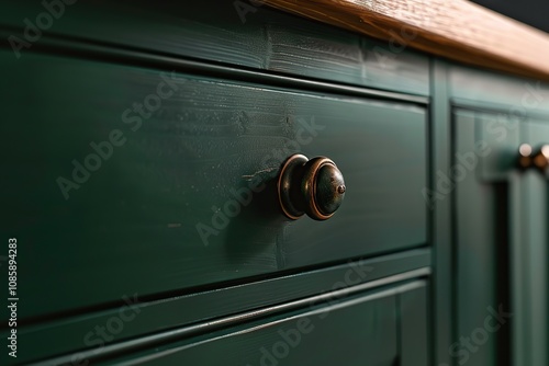 Front kitchen wooden frame cabinet door and drawers. Closeup Green Kitchen with wooden cabinet door, brass door handles, furniture base set. Trendy interior units. Home improvement concept. Samples.