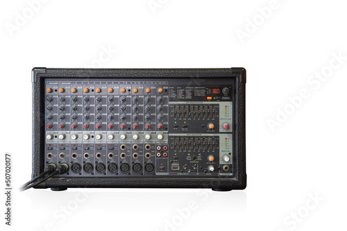 front view, black plastic mixer power amplifiers on white background, object, sound, technology, copy space