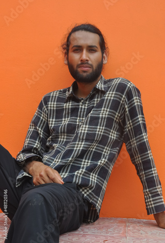 20s, adult, attractive, background, beard, bearded, casual attire, charming, clothes, coloured, confident, copy space, fashion, front view, good-looking, graceful, guy, photogenic, indian, isolated, lifestyle, man, man, model, one person, orange, outdoors, outside, people, person, portrait, posing, sexy, shirt, sitting, style, holiday maker, traveler, wall, young, young adult, young men, male