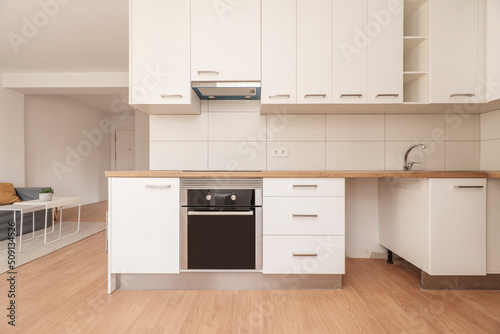 Front view of a new open plan kitchen with wood counters, white cabinets and stainless steel appliances, hardwood flooring and a cut out for a dishwasher