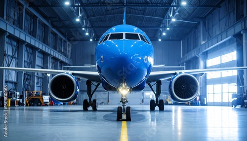 Front view of an airplane in a hangar in dark blue. Airplane maintenance, aircraft repair service concept.