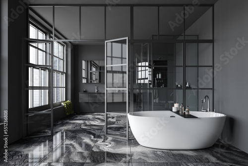 bathroom, interior, room, bathtub, apartment, home, mirror, double, sink, glasses, partition, panoramic, window, tile, marble, floor, modern, bathe, tub, city, skyscraper, grey, wall, design, house, shelf, crockery, cosy, front, view, trendy, contemporary, style, clear, loft, hotel, minimalist, decoration, carpet, large, dark, concept, water, treatment, architecture, furniture, three-dimensional, rendering, render