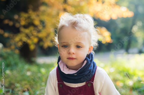 family, children, beautiful, outdoors, nature, joy, love, park, people, childhood, young, enjoying, leisure, together, sunlight, tree, human relationships, outside, healthy, walk, autumn, forest, leaf, fall, small, countryside, girl, female, toddler, standing, blond, cute, portrait, front, view, happy, cheerful, denim, jacket, daughter