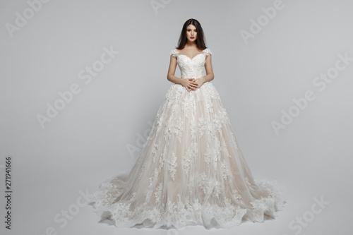 Frontal view of a amazing female model in long princess wendding dress, isolated on a white background.