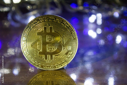 Frontal view of golden Bitcoin with bokeh light effect background. Cryptocurrency concept.