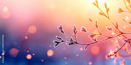 Frost-covered branches against a colorful pastel sky at sunrise, with soft bokeh lights, evoking a serene and magical winter morning atmosphere