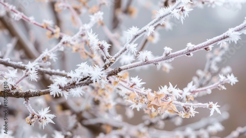 Frost-covered branches create a delicate and beautiful winter scene. The icy details and snow-covered twigs evoke the serene and cold atmosphere of a winter wonderland.
