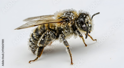 bee, insect, frost, glacé, cold, winter, macro, closeup, animal, wildlife, nature, arthropod, invertebrate, furry, hairy, wing, antennae, leg, isolated, white, background, detail, texture, crystalline, ice, weather, environment, climate, change, survival, resilience, adaptation, fauna, outdoors, natural, science, biology, zoology, entomology, honey bee, apis, pollination, pollinator, agriculture, ecology, ecosystem, conservation, fragile