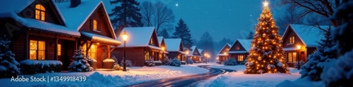 Frosty snow-covered village square at night with twinkling lights and Christmas tree , frozen landscape, festive atmosphere