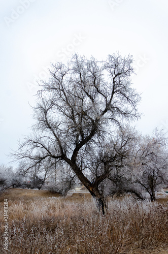 tree, nature, sky, landscape, winter, tree, field, blue, forest, cold, grass, season, cloud, bare, snow, tree branch, frost, white, lonely