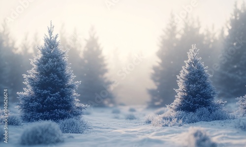 Frosty winter landscape in snowy forest. Christmas background with fir trees and blurred background of winter