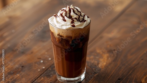 Frothy Delight. A Layered Beverage with Sweet Topping and Dark Drizzle on Wooden Surface.