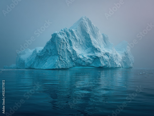 Frozen blue iceberg with soft highlights and subtle fog in background creates serene and cold atmosphere.