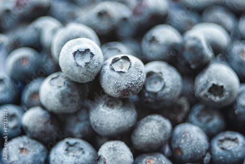 Frozen Blueberry background. close up with selective focus Concept of healthy and dieting eating. classic blue background