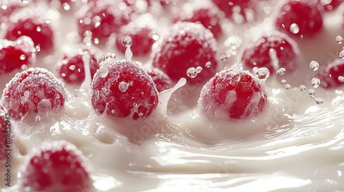 Frozen raspberries splashing into creamy milk.