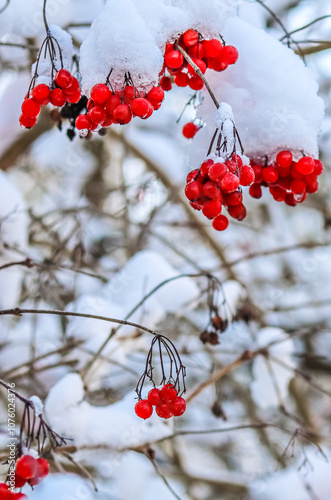 Frozen red berries of viburnum covered with hoarfrost and white snow